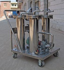 由初濾器、油泵和過濾裝置組成。初濾器為一筒狀金屬網,阻止不純淨油中較大的固體顆粒進入油泵。油泵通常為齒輪泵,輸送不純淨油進入過濾裝置。過濾裝置為一小型手工壓緊的板框壓濾車,用專用濾紙作過濾介質。不純淨油在油泵壓力作用下進入板框壓濾車,透過濾紙成為濾清油。油中的固體雜質被截留在濾紙表面,少量的水分被濾紙的毛細孔吸收。過濾壓力通常不大於0.3兆帕。當濾紙表面沉積雜質太多,過濾壓力升高到0.35兆帕時,或當濾紙吸收的水分接近飽和,濾清油中殘留的水分不再降低時,應停機更換濾紙。油的粘度較高時,可預熱以降低粘度後再行過濾。這種濾油機只能除去固體雜質和少量水分,適用於一般電器用油和潤滑油的提純。當油中含水分和雜質過多時,須經預處理後再送入濾油機。普通濾油車的處理量為25~200升/分。過濾裝置的方形濾框有200毫米、250毫米、320毫米、450毫米、630毫米等。濾板和濾框用鑄鐵或聚丙烯製成。真空濾油車