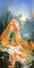 火神出現在維納斯和戰神馬爾斯面前:弗朗索瓦·布歇(Francois Boucher),1703年生於巴黎,父親是圖案畫家。從少年時代受父親的教育,是個極其早熟的人,二十歲時就獲得美術院展覽會的一等獎。之後,他在義大利留學四年多,技術越來越高。回到巴黎後,聲譽大振,以至受到貴婦人們的沙龍的接待。路易王朝的貴婦人的沙龍是有名的學者、政治家、詩人、音樂家、畫家等聚會的場所,受到這樣沙龍的接待是無上光榮的。弗朗索瓦·布歇由於這種關係就開始結識了各方面的人士。他既畫歌劇院的布景,也畫壁掛織物圖樣。因此,不久他的才能被路易十五世的情人蓬帕杜夫人所賞識,畫了幾幅她的肖像畫。蓬帕杜夫人是路易王朝第一美人,而且是才女。弗朗索瓦·布歇又為這個奢侈享樂的美女設計女服和裝飾品,他設計的圖案成為當時出入宮廷的貴婦人們所效法的榜樣。他如願以償地獲得了美術院院士的頭銜、晉升為教授。在他62歲時,他的聲望日隆直至巔峰,當上了法國美術院院長、皇家首席畫師。1770他離開了這個世界。