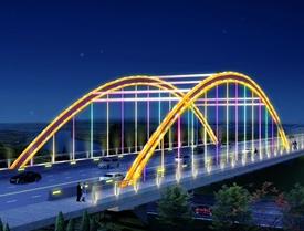 煙臺牟平西郊路北延跨線橋工程位於煙臺市牟平區三山大街與濱海路之間,上跨煙威一級路,預計2010年9月底竣工通車。 該橋建成後將成為煙威地區單跨最長的拱橋。 牟平西郊路跨線橋結構形式為單孔80米中承式鋼管混凝土拱橋,橋樑總長110.02m,拱肋計算跨徑為81.42m,計算矢高為25.35m,跨比為1:3.2。