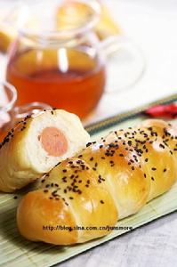 高筋麵粉140克,水80克,細砂糖20克,黃油15克,雞蛋液10克,鹽1/4小勺,乾酵母1小勺,奶粉1小勺,火腿腸5根。