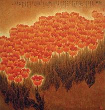 《春暉》、《井岡杜鵑紅》是工筆重彩畫家王天勝的代表作。數十百朵的鬱金香、杜鵑花重重疊疊、密集排布,形成一種連天接地的恢宏氣勢;溪流、山石及園圃在花朵的空隙間偶爾展露,成片的花朵便擁有了一個真實可感的生存空間。這也是王天勝以詩一般的情懷全力營構的美的空間。滿眼絢爛的連片紅色或橙色,是這一空間在表面形態上的直觀呈現,它以眾多花朵的同構複合,累積成視覺上的擴張感,從而為這一空間贏得觀賞效果上的關注力,在展廳中,王天勝的作品因此而格外醒目。更為重要的是,這一美的空間,並不只是靠著華麗的外表裝扮。當人們走近這一空間,就會發現這裡的內容與情節又是那樣的豐富。在此,王天勝又用細膩的筆法,不厭其煩地描繪著花與枝的穿插、花與花的顧盼、花葉的翻轉向背,花蕊的伸展曲張,因而,看似面貌相近的花朵枝葉,就仿佛都具有了各自的性格,它們聚集在這裡,爭相展示著各自的姿色。畫面中的每一處關乎細節的形態、質感及空間關係,都在王天勝的畫筆下被精緻地推敲與描畫。生機盎然、清麗怡人的自然之美就在這種微妙而細緻的刻畫中而呈現。遠觀取其勢,近觀品其質,王天勝工筆花鳥畫之美在不同界域的空間都得到了合適的表達;整體的營造氛境與局部的細膩表現,又統一於一種濃麗的畫風之中。以此,王天勝用線、色塑造了其工筆重彩畫的唯美品格。王天勝擅於駕馭線條,他的線條與傳統的鐵線、遊絲等不同,是根據物象的不同形、質而調動線條的粗細、輕重、提按、使轉、濃淡、乾濕,在表達花枝草葉等自然形貌的同時,線條自身的表現性也得到充分展現。作為全畫之“骨”,這種具有表現性的線條,就是經過了此後色彩的重重積染,其清麗的風神依然動人。王天勝更擅於賦色,不僅能在某一色彩基調下表現出色彩的微妙變化,而且更以一種細膩的分染之功,於勻整的色階過渡中,讓色彩質感與品味得以充分表達。正是用這樣的線、這樣的色,王天勝在當今中國畫壇成功地演繹著工細絢麗的創作風格。這種工細絢麗的工筆畫風,無疑是來自中國花鳥畫史上的“黃家”傳統。這一傳統,以五代西蜀黃筌為開宗,又由其子居寀傳播於北宋,在後來的北宋、南宋畫院中形成影響,在明代有邊景昭、呂紀繼其後,到清代,又有蔣廷錫、馬元馭等遠承其緒,近現代以來,有於非庵作為代表。這是中國繪畫史上的一個重視色彩表現,強調繪畫華貴品質的風格流派。因此,當王天勝以其“黃家富貴”的畫風,在當代畫壇取得令人矚目的位置,也正可反映出,當今的審美,已多么不同於從前,國勢昌盛、文化振興的今天,正呼喚著一種絢麗堂皇的畫風,就像盛唐時期那樣。勾勒、分染的描繪程式,謹細工致的繪畫態度,體物寫實的創作精神及濃麗繁縟的繪畫樣式等,都表明王天勝的工筆花鳥與“黃家”傳統的一脈相承。但是,如果我們進一步深入比較,就可以發現,王天勝的作品中雖然顯露著黃家畫風無所不在的影響力,但他卻並沒有在黃氏身後亦步亦趨。因為,我們會看到,王天勝正以一種現代的審美情懷,對黃家花鳥進行了創造性的發揚。這種發揚,主要表現在王天勝以現代繪畫中的構成意識和現代人的形色感覺來結構畫面,從而,用一種繁複的鋪排營構一種畫面氣氛。可以說,在黃氏畫派中,還很少見到像王天勝《井岡杜鵑紅》那樣可以震撼視覺的作品。同時,王天勝又在寫實的描繪中注入裝飾性元素,在大量同構線形的復調中,渲染出動人意境。這種裝飾性表現,主要借鑑於民間美術及工業設計,這對成長於新中國時期的王天勝來說是自然的,而對古代黃家一派花鳥畫家來說,則是不可想像的。