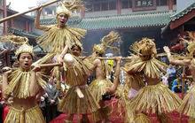 110名土家族兒女身披稻草紮成的草衣,赤著雙腳,面部用稻草紮成的帽子遮住,頭上用稻草和棕樹葉擰成沖天而豎的五根草辮,在舞台上歡快舞動,把飛濺著原始古樸音符的毛古斯舞蹈表現得淋漓盡致 。