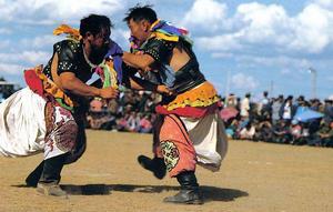 “那達慕”大會是蒙古族歷史悠久的傳統節日,在蒙古族人民物質生活中占有重要地位。每年七、八月牲畜肥壯的季節舉行“那達慕”大會。這是人們為了慶祝豐收而舉行的文體娛樂大會。“那達慕”,蒙語的意思是娛樂或遊戲。“那達慕”大會上有驚險動人的賽馬、摔跤,令人讚賞的射箭,有爭強鬥勝的棋藝,有引人入勝的歌舞。大會召開前,男女老少乘車騎馬,穿著節日的盛裝,不顧路途遙遠,都來參加比賽和參觀。大會第一項一般是摔跤比賽,摔跤手腳登高筒馬靴,下身穿寬大的綢緞摔跤褲,上身穿“昭得格”(一種皮革制的坎肩),在脖頸上圍有五彩繽紛的飾物“江戈”,仿古代騎士跨著大步,繞場一周。賽馬也是大會上重要的活動之一。比賽開始,騎手們一字排開,個個扎著彩色腰帶,頭纏彩巾,洋溢著青春的活力。賽馬的起點和終點插著各種鮮艷的彩旗,只等號角長鳴,騎手們便紛紛飛身上鞍,揚鞭策馬,一時紅巾飛舞,如箭矢齊發。先到達終點者,成為草原上最受人讚譽的健兒。射箭比賽也吸引著眾多牧民。技藝高超者可百發百中,贏得觀眾的陣陣喝彩。“那達慕”大會又是農牧物資交易會。除了工業和農副產品外,還有具有民族特色的飲食,如牛羊肉及其熏乾製品、乳酪、奶乾、奶油、奶疙瘩、奶豆腐、優酪乳。