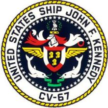“甘迺迪”號艦徽1956年12月27日,小鷹級首艦CV-63“小鷹”號在紐波特紐斯造船及船塢公司開工建造,1960年5月21日下水,之後又陸續建造了2號艦“星座”號和3號艦“美國”號,在建造第四艘之前,原本計畫採用核動力,最後因經費不足,仍然使用常規燃燒重油作為動力來源。