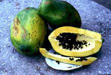 番木瓜番木瓜果皮光滑美觀,果肉厚實細緻、香氣濃郁、汁水豐多、甜美可口、營養豐富,有“百益之果”、“水果之皇”、“萬壽瓜”之雅稱,是嶺南四大名果之一。木瓜富含17種以上胺基酸及鈣、鐵等,還含有木瓜蛋白酶、番木瓜鹼等。半箇中等大小的木瓜足供成人整天所需的維生素C。木瓜在中國素有“萬壽果”之稱,顧名思義,多吃可延年益壽。