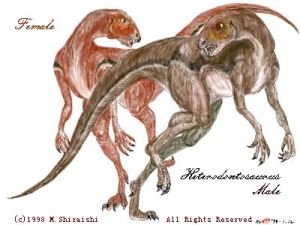 復原圖大部分鳥臀目恐龍的上頜沒有牙齒,並演化形成角質喙,面頜部只有一種心態牙齒,然而異齒龍卻與眾不同,它竟然有3種形態的牙齒,這恰是它得名的根據。第一種牙齒位於上頜部前方、喙嘴兩側,是小型牙齒,與下頜的無齒角質喙咬合,可能用來切斷葉子與根部。第二種牙齒是一對大型長牙,功能仍不清楚,但有觀點認為第二種牙齒是種性別上的展示物,或是威嚇與攻擊用。第三種牙齒是長而方形的高冠頰齒,這是咀嚼的適應結果(咀嚼在一些鳥腳類如鴨嘴龍類中相當普遍,但在其他爬行動物中部普遍)。3種牙齒中最有意思的就是那對大型長牙,也稱犬牙,是最顯著的標誌。除了牙齒,異齒龍的前後肢也很有意思。它的前肢很長,是後肢長度的70%,發育得很好的肱骨和凸出的尺骨表明他們長有強健的雙臂。
