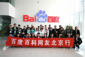 2010年4月10日上午,自由活動,11:00--12:30分午飯。12:50乘車百度大廈正式聚會。首先百科船長率領百科工作人員,熱情迎接31位科友,並在百度大廈門前合影留念。隨後在船長和講解員的帶領下,參觀了神秘的百度大廈內部,重點講解了【五福降中天