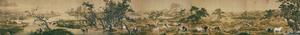 清代是中國宮廷繪畫的頂峰,來自義大利的傳奇畫家郎世寧,則是清代宮廷繪畫領袖,正是在他中西合璧繪畫技法的影響下,才形成了別具一格的清代宮廷畫風。郎氏善畫馬,《百駿圖》是其平生百餘幅馬作品中的傑作。此圖描繪了姿態各異的駿馬百匹放牧游息的場面。全卷色彩濃麗,構圖複雜,風格獨特,別具意趣。