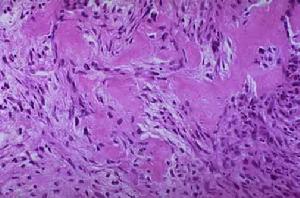 超生顯像病理學檢查:大體標本呈棕紅色,無色膜,質地較軟,其中可有骨纖維樣結構。病變常常沒有包膜且相當堅固,這取決於已形成新生骨質的數量。顯微鏡下可見有染色過深的核和無數有絲分裂圖形的惡性紡錘形細胞骨樣和新生骨形成明顯。在許多病例,腫瘤基質含有軟骨和纖維瘤樣成分及無數血管,薄壁的竇狀間隙在其腔內可含有細胞。骨源性肉瘤可能來源於有骨分化能力的間質細胞在骨Paget病和骨纖維異常增殖症有較多機會發生骨肉瘤,其原因未明。