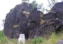 石瀑碣石山石瀑地點黑石遍地,似炭似鐵,有的拳頭大,有的秤砣般,好像煤礦的矸石堆。
