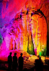 洞內堪稱一絕的是“仙人田”。那一層一層的梯田,錯落有致,“田埂”彎彎曲曲,“田間”大小不一,田水一如平鏡。潺潺流水,自上而下,沿著層層梯田灑下,在“田埂”上掛起道道水簾,讓人目不暇接,眼花繚亂!