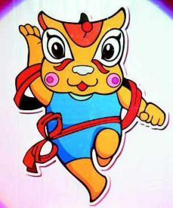 “躍躍”具有運動員的健壯體魄,動感十足,涌動著一股沖天的豪氣,具有極強的拼搏向上的力量感。用飄動的紅絲帶編成的蝴蝶結組成醒目的8字形狀,突出第八屆大運會。紅綢帶的線條柔美,有韻律感,與“躍躍”整體雄健有力的動態相結合,形成剛柔相濟的韻律節奏。