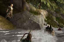 用弓箭消滅沿路的敵人,躲避礁石,順利漂流。