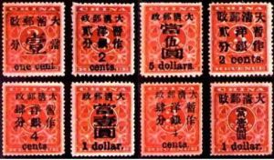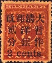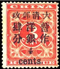 1897年2月2日,由於郵政業務需要,便將其黑字加蓋.集郵界稱為紅印花加蓋郵票,簡稱“紅印花”。加蓋面值為5種,即3分改1分、2分、4分、I元和5元。加蓋數量分別是19900枚、350000枚、50000枚、29900枚和20000枚。同年9月30日停用。從加蓋的字型大小著,又有所不同,有大字1分、2分、4分、1元、5元和小字2分、4分、I元。由於加蓋工作是由海關造冊處和一家私人印刷廠完成的,所以使用的鉛字和位置有所不同,從而形成了復蓋、倒蓋、倒蓋兼復蓋等珍品。
