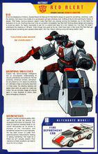 紅色警報紅色警報的智力略勝常人,他對各種保全程式和安全守則倒背如流。他的感測器系統非常發達,可以鎖定1200英尺外大小僅2厘米的目標,偵測到1.4英里外微晶片落地的聲音。他的嗅覺感測器能夠檢測到濃度只有百萬分之2的氣味。紅色警報可以發射遠程示警信號,並將緊急情況報告給博派。任何事情,哪怕是只有一點點不好的苗頭,都會令紅色警報立刻聯想到危險,並立即做好示警準備。讓他停下來鬆口氣幾乎是不可能的事。