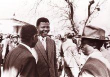 1950年曼德拉與兩名“叛國罪”同犯聊天。1960年3月21日,南非軍警在沙佩維爾向正在進行示威遊行的五千名抗議示威者射擊,慘案共導致了69人死亡,180人受傷,曼德拉也因此被捕入獄,但是最後通過在法庭辯論上為自己的辯護,而無罪釋放。