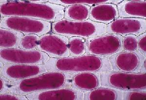 直接分裂的早期,球形的細胞核和核仁都伸長。然後細胞核進一步伸長呈啞鈴形,中央部分狹細。最後,細胞核分裂,這時細胞質也隨著分裂,並且在滑面型內質網的參與下形成細胞膜。在直接分裂中,核膜和核仁都不消失,沒有染色體的出現,當然也就看不到染色體複製的規律性變化。但是,這並不說明染色質沒有發生深刻的變化,實際上染色質也要進行複製,並且細胞要增大。當細胞核體積增大一倍時,細胞核就發生分裂,核中的遺傳物質就分配到子細胞中去。至於核中的遺傳物質DNA是如何分配的,還有待進一步的研究。