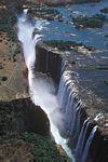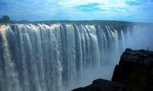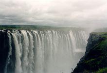 尚比亞李文斯頓附近的維多利亞瀑布 大瀑布所傾注的峽谷本身就是世界上罕見的天塹。在這裡,高峽曲折,蒼岩如劍,巨瀑翻銀,疾流如奔,構成一副格外奇麗的自然景色。大瀑布傾注的第一道峽谷,在其南壁東側,有一條南北走向峽谷,把南壁切成東西兩段,峽谷寬僅60餘米,整個贊比西河的巨流就從這個峽谷中翻滾呼嘯狂奔而出。大瀑布的水汽騰空達300餘米高,使這個地區布滿水霧,若逢雨季,水沫凝成陣陣急雨,人們站在這裡,不消幾分鐘,就可渾身濕透。
