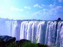 維多利亞瀑布 觀賞大瀑布,從盧薩卡出發,可以駕車或乘飛機去。乘遊艇暢遊大瀑布的上游——贊比西河。從上游可以看到瀑布的輪廓。贊比西河是非洲第四長河,流向從西向東,南岸是辛巴威,北岸是尚比亞。河面很寬,但水流平緩。河中有一小島,用望遠鏡可看到島上徜徉的一群群大象。突然聽到隆隆的響聲,顯然是遊艇已接近瀑布。在盛水期,你從幾里甚至幾十里開外,就能看到瀑布激起的沖天水柱,一團團不斷向上翻湧,在藍天白雲間飄散開去。當地稱該瀑布為“莫西奧圖尼亞”,意思是“雷鳴之煙”。