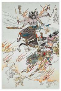 羅宣且說殷郊著傷,逃回進營納悶,鬱鬱不樂。且說轅門外來一道人,戴魚尾冠,面如重棗,海下赤須紅髮,三目,穿大紅八卦服,騎赤煙駒。道人下騎,叫:“報與殷殿下,吾要見他。”軍政官報入中軍:“啟千歲!外邊有一道者求見。”殷郊傳令請來,少時道人行至帳前。殷郊看見,降階迎接,見道人通身赤色,其形相甚惡;彼此各打稽首,殷殿下忙欠身答曰:“老師可請上坐。”道人亦不謙讓,隨即坐下。殷郊曰:“老師高姓大名,何處名山洞府?”道人答曰:“貧道乃火龍島焰中仙羅宣是也。因申公豹相邀,特來助你一臂之力。”殷郊大悅,治酒款待。道人曰:“吾乃是齋丕用葷。”殷郊命治素酒相待不提。一連在軍中過了三四日,也不出去會子牙。殷郊問曰:“老師既為我而來,為何數日不會子牙一陣?”道人曰:“我有一道友,他不曾來;待他來時,我與你定然成功,不用殿下費心。”且說那日正坐轅門,軍政官來報:“有一道者來訪。”罷宣與殷郊傳令請來。少時見一道者,黃臉 須,身穿皂服,徐步而來。殷郊乃出帳迎接至帳行禮畢,尊之上坐。羅宣問曰:“弟為何來遲?”道人曰:“因攻戰之物未完,故此來遲。”殷郊對道人曰:“請問道長高姓大名?”道人曰:“吾乃九龍島鍊氣士劉環是也。”殷郊傳令治酒款待。次早二位道者出營,來至城下,請子牙答話。探馬忙報入相府:“啟丞相!有二位道人,請丞相答話。”子牙隨 即同眾門人出城,排開隊伍;只見陣催鼓響,對陣中有一道者,怎生兇惡,怎見得?魚尾冠,純然烈焰;大紅袍,片片雲生。絲絛系赤色,麻履長紅雲;劍帶星星火,馬如赤爪龍。面如血潑紫,鋼牙暴出唇;三目光輝觀宇宙,火龍島內有聲名。話說子牙對眾門人曰:“此人一身赤色,連馬也是紅的。”眾弟子曰:“截教門下,古怪甚多。”話未畢,羅宣一騎馬當先,大呼曰:“來者可是姜子牙?”子牙答曰:“道兄!不才便是。不知道友是何處名山,那座洞府?”羅宣曰:“吾乃火龍島焰中仙羅宣是也。吾今來會你,只因你依仗玉虛門下,把吾輩截教,甚是恥辱;吾故到此,與你見一個雌雄,方知二教自有高低,非在於口舌爭也。你的左右門人,不必向前,料你等不過毫末道行,不足為能,兄我與你比個高低。”道罷,把赤煙駒催開,使兩口飛煙劍,來取子牙。子牙沖手中劍急架相迎,二獸盤桓,未及數合,哪吒登開風火輪,搖槍來刺羅宣:旁有劉環躍步而出,抵住哪吒。大抵子牙的門人多,不由分說,楊戩舞三尖刀殺過來;黃天化使開雙錘,也來助戰。雷震子展開二翅,飛起空來,將金棍刷來;土行孫使動 鐵棍,往下三路也自殺來;韋護綽步使降魔杵劈頭,四面八方圍裹上來。羅宣見子牙眾門人,不分好歹,一擁而上,抵當不住,忙把二百六十骨節搖動,現出三頭六臂,一手執照天印,一手執五龍輪,一手執萬鴉壺,一手執萬里起雲煙,雙手使飛煙劍,好利害。怎見得?有贊為證: