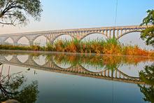 長崗坡渡槽長崗坡渡槽全長達5200米,寬6米,有133個石砌橋墩、132個跨拱,最高一個墩高達37米,拱的最大跨度達51米,渡槽兩邊設有行人道。渡槽凌空飛架橫跨在長崗坡上。