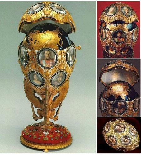 羅曼諾夫王朝歷代人物肖像“羅曼諾夫王朝300周年”彩蛋的驚人之處還在於,它表現了在羅曼諾夫王朝的統治下,俄羅斯國家建立和鞏固的思想。在彩蛋內部固定著一個旋轉的鋼質地球儀,深藍色代表大海和大洋的色彩,球面上有用彩金描繪的大陸,而且繪製了兩個北半球。在其中的一個上能看到1613年時的俄國領土,在另一個北半球上則是1913年時俄國的疆界。這個復活節禮物明確而極具獨創性地表達了這樣一個思想:在羅曼諾夫王朝統治的300年間,俄國從以前的“莫斯科公國”變成“俄羅斯帝國”,疆域得到了大幅擴展。這一復活節彩蛋是極具特色的政治宣言,它宣布:俄羅斯帝國已經躋身於世界一流強國之列。