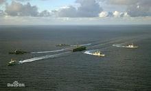 向北海挺進的艾森豪號航空母艦戰鬥群1981年8月,美國海軍首次進行里根政府提出的前進部署戰略的演習,稱為NorthSwordMagic。在此演習中,艾森豪號航空母艦的戰鬥群向蘇聯軍力核心地帶的摩爾曼斯克的可拉半島前進,渡航過程中嚴格實行射頻輻射控制(EMCON)來避免被蘇聯的海洋監視系統(SOSS)的被動截收裝備探測到。艾森豪號的戰鬥群沿著距離挪威北岸10個經度的航向朝巴倫支海前進;艾森豪號戰鬥群一直前進度北緯70度以北,東經15度以東的位置,前沿的護航編隊(包含一艘巡洋艦、三艘護衛艦)才被一架沿著固定航向的蘇聯長程偵察機發現。