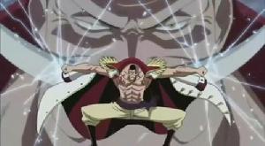 白鬍子白鬍子和赤犬發生大戰。赤犬阻擋在前,並用岩漿展開攻擊。白鬍子揮拳,用震動的波動把岩漿打回,並且揮刀擊毀了赤犬身後的城鎮。雙方開始大打出手,不分勝負。白鬍子數度揮刀,均被赤犬用腳、用手擋住;而赤犬數次對白鬍子噴發岩漿,亦被白鬍子的霸氣給阻擋,此時,白鬍子突然抽搐,神情痛苦地吐了一大口鮮血,單膝跪地,被赤犬乘機重創,腹腔被岩漿燒出一個大洞。其後,海軍一擁而上對他發動猛攻。白鬍子被大炮擊中臉部,身上也有多處刀劍傷。
