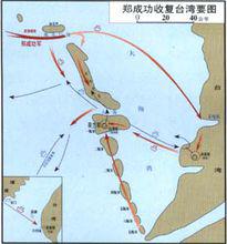 航線鄭成功計畫已定;首先派出部分戰艦,浩浩蕩蕩,裝作從南航道進攻。荷蘭殖民軍急忙調集大批軍隊防守航道。為了迷惑敵人,鄭成功的部隊聲威浩大,喊聲震天,炮火不斷。這一下,鄭成功非常成功地把殖民軍的注意力全部吸引到了南航道。北航道上一片沉寂,殖民軍以為平安無事。南航道激戰正酣,在一個月明星稀之夜,鄭成功率領主力戰艦,人不知,鬼不覺,乘海水漲潮時機迅速登上鹿耳門,守軍從夢中驚醒,發現已被包圍。鄭成功乘勝進兵,從背後攻下赤嵌城。荷蘭殖民軍狼狽逃竄,台灣又回到祖國懷抱。