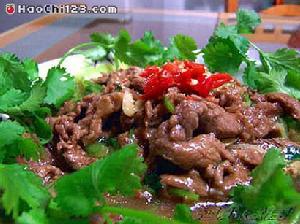 2、香菜取桿切成段,加入蔥絲、薑片、蒜片、鹽、味素、料酒、胡椒粉、醋和少許水,坐鍋點火倒油,下醃好的肉片翻炒變色後,將配料放入翻炒均勻,淋香油出鍋即可。