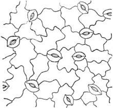 上表皮細胞垂周壁略平直,有串珠狀增厚,表面有明顯角質紋理,報導孔較少,不等式、正表皮細胞垂周壁略彎曲,增厚現象不明顯,表面亦有角質紋理。上下表皮均有單細胞非腺毛,有兩種類型:一種稍短,呈圓錐形,壁厚,有明顯疣狀突起,長50-85μm,直徑20-30μm;另一種長,略彎曲,壁有短線紋,長160-360μm,直徑20-30μm。葉肉組織中可見草酸鈣簇晶,直徑15-40μm。