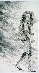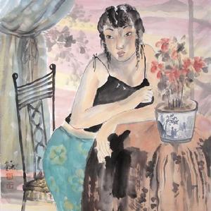 以《都市閒情》命名的系列作品,令人耳目一新的是——這是一種新的視覺,一種新的筆墨語言秩序,一種充滿內在節奏的情緒表達。平面空間中的二維人物、環境,在畫家筆下都相當簡潔,畫面中的人與物都是空間中的符號,在無中心與無邊緣中,都處於同一平面中,而筆墨、形式與意象、符號表現了直覺視界中的固有形式;雖然,拋棄了透視,消解比例,沒有體量,隱去了光影,但營造了一種新的平衡,畫面上產生了自然的、寧靜的、耐人尋味的情緒範圍,在這裡,展開了“當下”青年女性的“心路歷程”是十分貼切的。