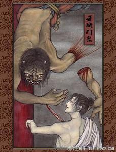 茨木童子 出自鳥山石燕的《畫圖百鬼夜行》。 源氏多田滿仲守衛天下的兩把刀分別叫做膝切和髭切。刀名字的由來據說是在攻擊的時候一刀攻擊膝蓋,一刀攻擊面門。大將軍賴光將其中的一把“髭切”賜給了四天王之一的渡邊綱。
