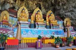 萬佛寺萬佛寺志是這樣記載:興義萬佛寺,座座青山靈秀,叢叢灌木蔥蘢,奇石挺拔,壘岩疊障,祥雲環繞,藤欏蜷曲,纏枝掛葉,綠蔭掩映,曲徑縈紆、直通農戶,民風淳樸,笑迎客座。山有恆古天然洞穴,神通造化,靈源貫注,頂懸鐘乳,自然形成、兜率天宮,天龍八部,群獅起舞,萬蝠洞,五百羅漢,送子觀音,金鳳凰、古營盤,形態各異,洞宇恢弘,石壁寬闊,留予題詠,嵐靄飄渺,斯洞於明朝嘉靖年間,有地方善信興建佛寺,冠以萬佛寺。塑有釋迦牟尼、觀音菩薩、五百羅漢諸聖像,功德莊嚴,時有僧眾數十人駐錫。晨鐘暮鼓、早晚課誦,香菸裊裊,十方善男信女前往參拜,絡繹不絕,可謂佛家香火之一時鼎盛。故名萬佛寺。