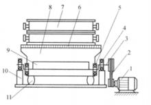 偏心振動落砂機它靠一根轉動的偏心軸3帶動整個落砂機框架和柵格運動:偏心軸通過一對支架軸承4支承在底座的支承架10上,而軸的偏心部分通過一對框架軸承5與框架8及柵格6連在一起。當電動機1通過V帶2帶動偏心軸鏇轉時,使落砂機框架產生振動:放在柵格上的鑄型不斷地被拋起,然後又靠自重下落與柵格發生撞擊.從而使鑄型破碎,型砂經柵格孔落下運走,砂箱及鑄件分別用運輸設備送出,平衡重9與偏心軸相對布置,用以減輕支承軸承4所受的動載荷。