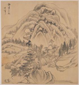 採用一河兩岸式的構圖,近景坡石上有雜樹一組,遠山的畫法為披麻皴、解索皴互用,間以渴筆點苔,有王蒙遺法。