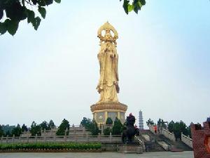 從蓮花塔下步入觀音聖境,筆直寬廣的朝境大道一直延伸到一個青石鋪砌的廣場,一座寶相莊嚴、慈顏善目、金光耀眼的望海觀音寶像屹立在廣場中央。舉目瞻仰,湛藍的天空中一朵朵白雲飄浮天際,襯托著觀音菩薩好像騰雲駕霧,彩霞披身。觀音像高40.88米,用120噸青銅鑄成,外貼純金180兩,是目前世界上最高的箔金觀音銅立像。觀音寶像面向東南,遙望浩瀚的獅子洋,“望海觀音”因而得名。
