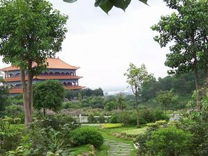 位於觀音室像旁邊的觀音閣雄偉莊重,氣勢恢宏,古色古香,建於1997年10月20日(農曆九月十九觀音誕)。觀音閣是一件建築藝術精品,用料精良,手工精細,閣中所有木雕,包括門窗、斗拱、神龕、供案等都是用名貴的紅木製成:地磚是專門研製的仿古階磚,牆壁全部用水磨的青磚舊料,閣內裝飾3362個精細描繪的天花藻井。觀音閣建築面積3872平方米,殿堂宏大,收藏和供奉的各種造型的玉雕、木雕、銅鑄、彩瓷觀音聖像共1000尊,是名副其實的“千佛閣”。大殿首層正中的千手千眼觀音,由香樟木雕刻而成,像高12米,盤腳而坐,容貌安詳。千年千眼寓意廣大圓滿而無所障礙地普度眾生。一般廟宇的千手觀音只有42條手臂,而本閣的這座觀音,是實實在在的千手千眼,有興趣的遊客不妨親自數一數。首層兩邊山牆的神台上,分別供奉有18尊形態各異的木雕觀音化身像,是以中國佛教“三十六觀音”的形象為基礎,吸取歷代觀音造型藝術的精華雕刻而成的,它們以端莊、俏麗、慈祥形態示人,大大縮短了人與神之間的距離。觀音閣第二樓兩側供奉青銅鑄造的觀音立像,像高1.7米,共18尊。其中有十三變相觀音和送子觀音。想早生貴子的旅客不妨撫摸一下送子觀音,它是本間內惟一可供游落撫摸的佛像。觀音閣第三樓,正中是漢白玉觀音佛像,高2.5米,是觀音閣的鎮閣之寶。兩側排列著形態各異,神聖而親切的18尊彩瓷觀音立像。觀音閣各層均有外廊,是最好的觀景台,憑欄眺望,珠江口風光盡覽無遺,風吹送爽,煩囂盡散。觀音閣前方是一個大花園,一座高三層的朝聖亭與觀音閣相互呼應。園內放生池中有一隻6米長的大石龜,大石龜背上和旁邊還有5隻活潑可愛的小石龜,分別代表“福”、“祿”、“壽”、“全”、大龜是“大壽”之意。據說,如果你用硬幣擲中龜頭,則會交上好運。池的東西兩面草坪上分別有用花卉砌成的巨型“佛”字和“南無阿彌陀佛”六字。花園整體環境與望海觀音、觀音閣融為一體,充滿濃郁的佛教氣氛。