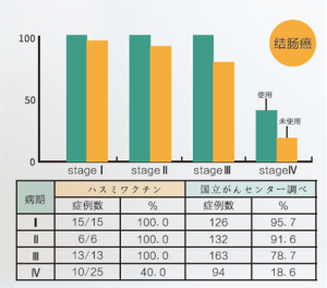 目前的數據表明,癌症手術後未使用疫苗的患者與在普通治療並用蓮見疫苗的患者相比,5年生存率得到了明顯提高。一般,癌症分為Ⅰ到Ⅳ期,Ⅰ期的5年生存率為90%左右。Ⅱ期的為70~80%。Ⅲ期為50%,Ⅳ期20%。蓮見疫苗可以在原有生存率基礎上每個分期提高20%五年生存率,具有良好的預防癌症、延長壽命的效果。例如下圖肺癌使用疫苗後的臨床對比數據,Ⅲ期肺癌治療並用蓮見疫苗,五年生存率提高近20%,即使是Ⅳ期癌症也有近13%的提高。