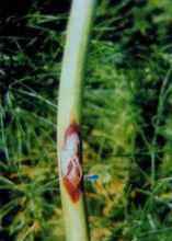 1.症狀: 發病期,在距地面30厘米處的主莖上,出現浸潤性褐色小斑,而後變成淡青至灰褐色,同時擴大成棱形,也可多數病斑相連成條狀。病斑邊緣紅褐色,中問稍凹陷呈灰褐色,上面密生針尖狀黑色小點。如空氣乾旱病斑邊緣清晰,不再擴大成為慢性型病斑。若於氣陰雨多濕,病斑可迅速擴大蔓延,致使上部的枝莖枯死。