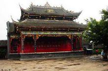 大戲台柱平面布置為內外兩層正方形。外層柱12個,為檐柱;內層柱四個,是構成戲台大空間的主體柱。立面造型為單檐人字形坡屋頂,四角起翹。屋脊正中塑精美造型頂,兩端塑龍尾,壓山脊尾端塑鳥獸花木。四爪角脊塑透空格花,尾部高高翹起。青灰色溝瓦、筒瓦,貓頭、滴檐上燒有精美花紋圖案。角梁頭雕龍頭,檐柱出挑,下有雕花吊墩、角花和伸弓。掛口和丈面方間有格花禾口窗。除戲台正面外,其餘三面的外層檐柱間設美人靠。柱身空透。柱立於距地面約1.5米的石台基上。台基正面有紅砂石精美圖案的深浮雕。台左後有十二步石階梯上戲台。戲台木雕為金黃色,黑色襯底。其餘檐、柃、梁、柱、美人靠、禾口窗、木地板均為朱紅色。