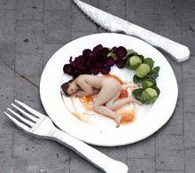 畫面中,赤裸的男、女躺在巨大的圓盤子上,身邊搭配著刀叉和整顆蔬菜,還撒著類似番茄醬的物質,逼真的午餐效果無不讓路人目瞪口呆,駐足欣賞。當然,對於此現象,眾人也是褒貶不一。