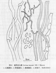 菌絲系統三體型;生殖菌絲透明,薄壁,具鎖狀聯合,直徑3-5μm;骨架菌絲無色,厚壁到實心,直徑3-6μm;纏繞菌絲無色,厚壁,多分枝,直徑1.5-2μm。子實層中有菌絲柱,35-62.5×20-37.5μm。