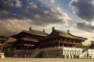 秦阿房宮遺址復原圖公元前202年,劉邦在長安(今西安城西北郊漢城)建立西漢王朝。劉邦定都關中,取當地長安鄉之含意,立名“長安”,意即“長治久安”。