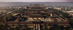 唐大明宮復原圖元初,長安城的範圍依然沿用五代初期唐長安城被毀後節度使韓建所重建的“新城”,並使用京兆府的名稱。至元九年(1272年),元世祖封其三子忙哥為安西王,鎮守其地,建安西王府。至元十六年(1279年)遂該京兆府為安西路。後來由於發生安西王叛亂,安西國被撤。皇慶元年(1312年),又改安西路為奉元路。據李好文在《長安志圖》中所繪《奉元城圖》,四面僅各一門,南門偏東,北門偏西,東西兩門也不對稱,城內建築也無對稱格局。市場集中在城內西北隅,有馬市、羊市和秦川驛等。東北隅有太子府(明秦王府)、城隍廟、察院等。馬可波羅於至元十二年(1275年)遊歷於此,寫到:“城甚壯麗,為京兆國之都會…此城工商繁盛,產絲多,居人以制種種金錦絲絹……凡人生必需之物,城中皆有,價值甚賤。”