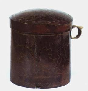 西漢醬褐色漆針刻鳥獸紋卮,酒器,圓筒形,有蓋。內外均髹醬褐色漆,以針刻紋填朱漆的手法裝飾,蓋上飾行龍,蓋內飾飛鳳,器身外壁飾立虎、仙鶴、玉兔、怪人等,並以流雲紋相間。