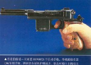 ▲丹麥伯格曼-貝亞德M1910/21半自動手槍,外觀酷似毛瑟C96軍用手槍。彈匣設在扳機護圈前方,射擊時槍口上跳較大