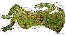 從《西藏鎮魔圖》上的寺廟位置看,女魔是頭東腳西而臥,其心臟在西藏政治、經濟、文化的中心拉薩,這樣的構圖是合理的,安排是恰當的。其地理範圍不僅包括了衛藏四茹,而且部分地超出了現在的區域境界。鎮魔圖的東邊到達四川藏區鄧柯,南接不丹,西至拉達克,北邊包括羌塘草原。當然,傳說畢竟是傳說,它與歷史有著一定的聯繫,但同史實尚有一定的距離。西藏畫師根據傳說繪成的《 》也必然與西藏地形圖不盡相同。既然要畫成魔女的形象,就不可能同地形圖完全吻合。所以鎮魔圖上的寺廟位置僅是示意,不會十分準確,有的甚至有錯位的可能。