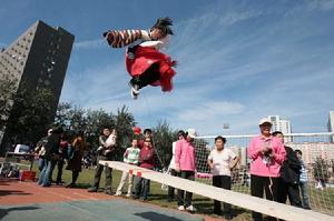 “表演”有自選動作和規定動作,主要根據比賽者的跳騰動作難度和姿勢進行評分。規定項目是將規定的幾種動作連線起來表演;自選項目有手持扇子、花環、彩帶等物進行的表演,可以不斷做出劈腿、弓身、鑽環、跳繩等十分優美的造型動作。
