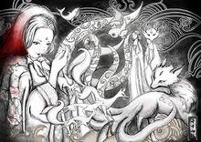辛十四娘北齋設計插畫師趙晨設計廣平馮生[1],正德間人[2]。少輕脫,縱酒。昧爽偶行,遇一少女,著紅帔,容色娟好。從小奚奴[3],躡露奔波,履襪沾濡。心竊好之。薄暮醉歸,道側故有蘭若,久蕪廢,有女子自內出,則向麗人也。忽見生來,即轉身入。陰念:麗者何得在禪院中?縶驢於門,往覘其異。入則斷垣零落,階上細草如毯。彷徨間,一斑白叟出,衣帽整潔,問:“客何來?”生曰:“偶過古剎[4],欲一瞻仰。翁何至此?”叟曰:“老夫流寓無所,暫藉此安頓細小[5]。既承寵降,有山茶可以當酒。”乃肅賓入。見殿後一院,石路光明,無復榛莽。入其室,則簾幌床幕,香霧噴人。坐展姓字,云:“蒙叟姓辛。”生乘醉遽問曰:“聞有女公子,未遭良匹[6]。竊不自揣,願以鏡台自獻[7]。”辛笑曰:“容謀之荊人。”生即索筆為詩曰:“千金覓玉杵,殷勤手自將。雲英如有意,親為搗元霜[8]。”主人笑付左右。少間,有婢與辛耳語。辛起,慰客耐坐,牽幕入。隱約三數語,即趨出。生意必有佳報,而辛乃坐與嗢噱[9],不復有他言。生不能忍,問曰:“未審意旨,幸釋疑抱[10]。”辛曰:“君卓犖士[11],傾風已久。但有私衷,所不敢言耳。”生固請之。辛曰:“弱息十九人[12],嫁者十有二。醮命任之荊人[13],老夫不與焉。”生曰:“小生只要得今朝領小奚奴帶露行者。”辛不應,相對默然。聞房內嚶嚶膩語,生乘醉搴簾曰:“伉儷既不可得,當一見顏色,以消吾憾。”內聞鉤動,群立愕顧。果有紅衣人,振袖傾鬟[14],亭亭拈帶。望見生入,遍室張皇。辛怒,命數人捽生出。